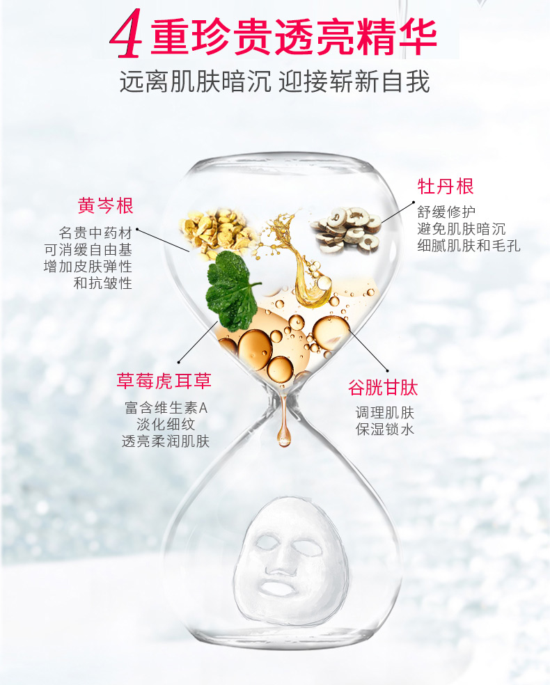 透亮:復(fù)合多種高效亮妍成分,改善肌膚暗沉,使肌膚透亮有光澤。