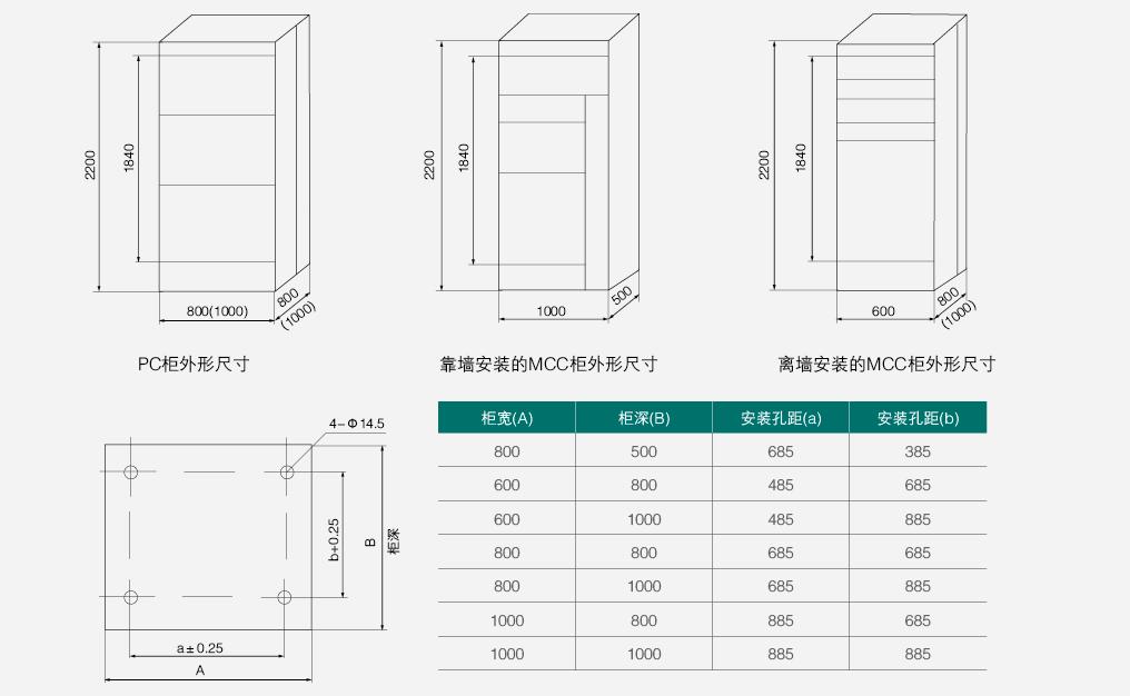 電動機控制中心(MCC)開關柜有靠墻安裝和不靠墻安裝二種,其頂部都為水平母線區域,水平母線區域下面為抽屜功能單元區域,該區域的寬度為600mm,安裝抽屜功能單元區域的高為1840mm,當柜體為靠墻安裝時柜的左部為功能單元區域,右部有一個200mm 寬的電纜出線區域,柜體外形尺寸為800/500/2200(寬/深/高),當柜體為離墻安裝時,柜體寬度為600mm,電纜出線區在柜體的后部, 柜體的外形尺寸為600×800(1000)×2200(寬×深×高)。柜體深度有800和1000二種,我們建議用戶選用1000深的柜體,以與PC 柜深度統一,當抽屜抽出柜外時,柜內帶電部分不外露,安全可靠。